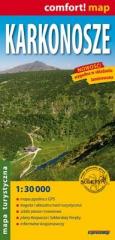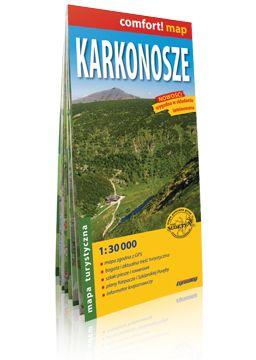Dwustronnie laminowana, łatwa w składaniu i trwała mapa turystyczna Karkonoszy w skali 1:30 000. Swoim zasięgiem obejmuje tereny od Jeleniej Góry na północy po Szpindlerowy Młyn na południu, od Jakuszyc i Harrachowa na zachodzie po Kowary na wschodzie. Mapa posiada bogatą treść przydatną zarówno dla turystów pieszych, rowerowych jak i narciarzy - m. in. ścieżki dydaktyczne, trasy rowerowe, szlaki piesze wraz z podanymi czasami przejść, niebezpieczne odcinki szlaków, oznaczenia zagrożenia lawinowego, wyciągi narciarskie oraz narciarskie trasy zjazdowe i biegowe. Zaznaczono szczegółowo rozróżnioną bazę noclegową - hotele, domy wczasowe i pensjonaty, schroniska górskie i młodzieżowe, kempingi oraz pola namiotowe. Dzięki cieniowaniu uzyskano plastyczny obraz rzeźby terenu. Dokładność i aktualność zapewnia mapie szczegółowa weryfikacja w terenie. Dodatkowo zamieszczono mapę szlaków turystycznych w skali 1:90 000, szczegółowe plany Karpacza i Szklarskiej Poręby w skali 1:15 000 oraz informator krajoznawczy ze zdjęciami. Mapa jest zgodna z GPS - posiada współrzędne geograficzne w układzie WGS-84.