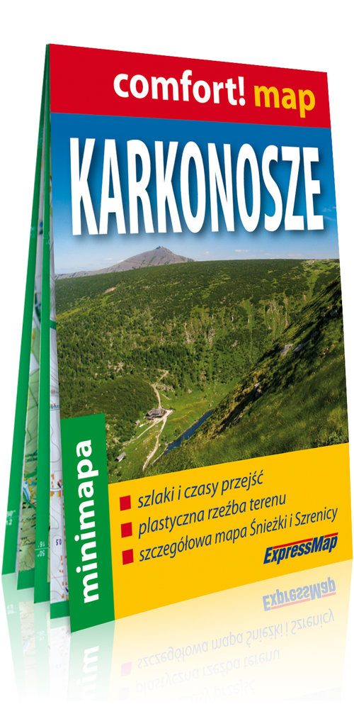 • mapa Karkonoszy w skali 1:90 000 (1 cm – 900 m) z zaznaczonymi szlakami pieszymi wraz z podanymi czasami przejść, schroniskami, wyciągami narciarskimi, a także cieniowaniem plastycznie pokazującym rzeźbę terenu,