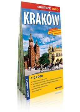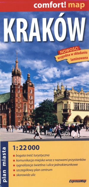 Dwustronnie laminowany, trwały i wygodny w użytkowaniu plan Krakowa. Szczegółowy rysunek zabudowy wraz z numeracją budynków wzdłuż ulic i na osiedlach, linie autobusowe i tramwajowe wraz z nazwami przystanków, sygnalizacja świetlna, ulice jednokierunkowe, parkingi, bogata treść turystyczna, m.in.: zabytki, muzea, hotele i inne istotne obiekty, budynki użyteczności publicznej, centra handlowe, szczegółowy plan Starego Miasta w skali 1:12 000 (1 cm - 120 m), skorowidz ulic.