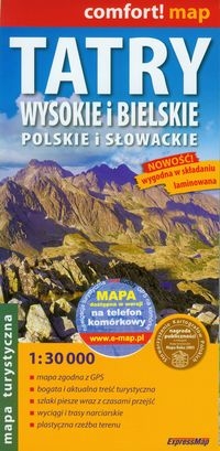 Dwustronnie laminowana, wygodna w składaniu mapa turystyczna polskich i słowackich Tatr Wysokich, mapa opracowana we współpracy z krajoznawcami z regionu, dogodna dla turysty skala 1:30000 (1cm - 300m), bogata treść turystyczna, m.in.: szlaki piesze i czasy przejść, nartostrady i trasy zjazdowe, schroniska górskie i młodzieżowe, kempingi, pola namiotowe, parkingi, postoje busów i dorożek, przystanki autobusowe. Cieniowanie plastycznie pokazujące ukształtowanie terenu, mapa zgodna z GPS - współrzędne geograficzne w układzie WGS-84.