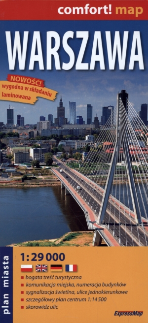 laminowany plan miastaRomantyczny spacer w Łazienkach, wycieczka do Wilanowa, a może spotkanie z przyjaciółmi w knajpce na Rynku? Z dwustronnie laminowanym, wygodnym w składaniu planem Warszawy dotarcie do celu na czas będzie dziecinnie proste.Pomoże w tym:szczegółowy rysunek zabudowy wraz z numeracją budynków wzdłuż ulic i na osiedlachlinie autobusowe i tramwajowe wraz z przystankami, linie Szybkiej Kolei Miejskiej (SKM) i Warszawskiej Kolei Dojazdowej (WKD)sygnalizacja świetlna, ulice jednokierunkowe, parkingi, stacje benzynowe,bogata treść turystyczna, m.in.: parki narodowe i krajobrazowe, rezerwaty przyrody, tramwaj wodny, zabytki, muzea, hotele, schroniska młodzieżowe i inne istotne obiekty,budynki użyteczności publicznej, centra handlowe,centrum w szczegółowej skali 1:14 500 (1 cm 145 m),skorowidz ulic.
