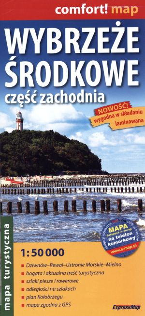 Wybrzeże Środkowe, część zachodnialaminowana mapa turystyczna 1:50 000format: 100 x 48 cm, po złożeniu 11 x 24 cmDwustronnie laminowana, łatwa w składaniu i trwała mapa turystyczna, pokazująca obszar od Wolińskiego Parku Narodowego aż po Koszalin. Obejmuje m.in. Dziwnów, Kamień Pomorski, Pobierowo, Rewal, Niechorze, Trzebiatów, , Mrzeżyno, Dźwirzyno, Kołobrzeg, Ustronie Morskie, Mielno, Karlino.mapa opracowana we współpracy z doświadczonymi krajoznawcami z regionudogodna zarówno dla pieszego, jak i rowerzysty skala 1:50 000 (1 cm ? 500 m)bogata treść turystyczna, m.in.: szlaki piesze i rowerowe oraz ścieżki dydaktyczne i spaceroweodległości na szlakach, muea, zabytki i inne interesujące obiektyparki narodowe, rezerwaty przyrody, atrakcje przyrodniczepoziomice pokazujące ukształtowanie terenumapa zgodna z GPS ? współrzędne geograficzne w układzie WGS-84plan Kołobrzegu w szczegółowej skali 1:15 000 (1 cm ? 150 m)