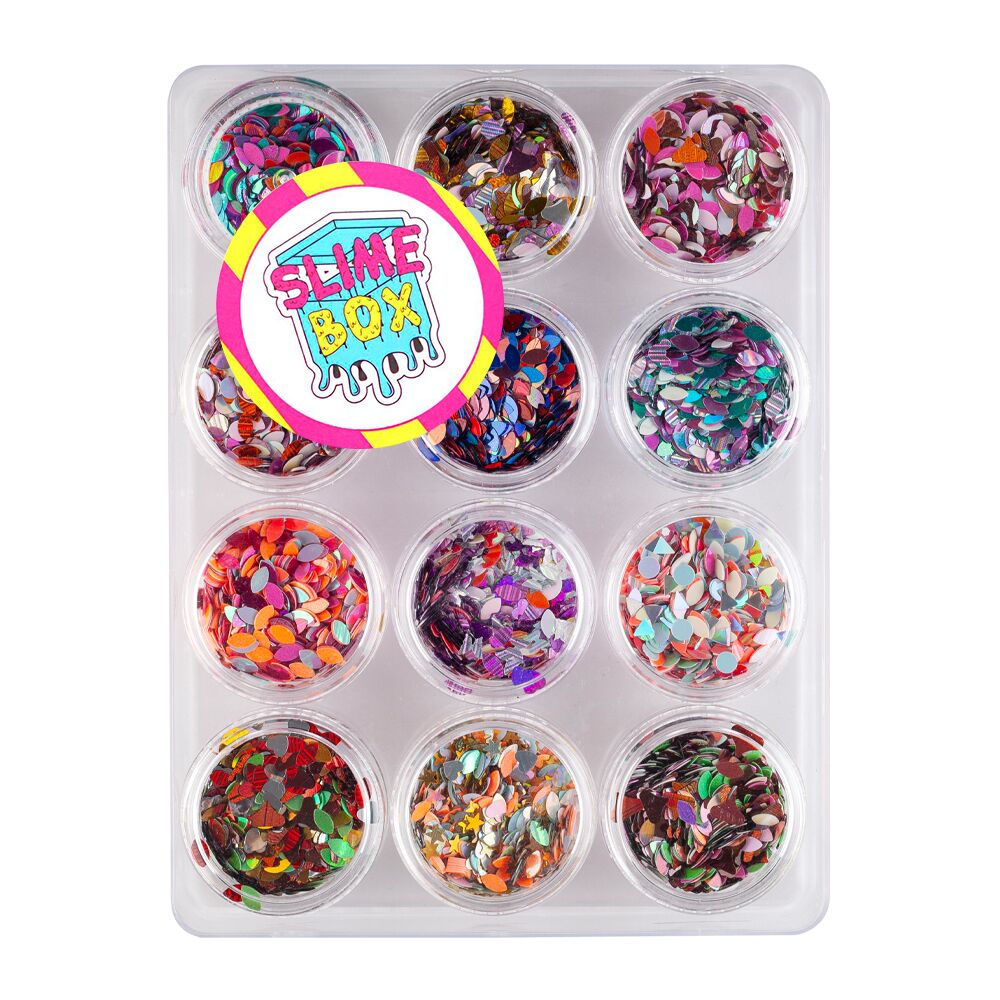 Zestaw 12 mini pojemniczków z holograficznymi brokatami confetti w różnych kształtach! Dostępny wyłącznie na slimebox.pl! Polecamy wypróbować z przezroczystym klejem. Efekt wow gwarantowany! Zawartość: 12 x 5 g