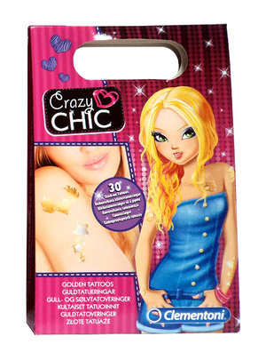 Bogaty i bezpieczny zestaw, aby wykonać fantastyczne, tymczasowe tatuaże o złotym połysku. Wybierz rysunek i posyp brokatem. będzie się wydawało, że nosisz na skórze prawdziwy klejnot. Zawiera wszystkie akcesoria oraz kompletny przewodnik, aby wykonać w sposób łatwy i bezpieczny przeróżne tatuaże w stylu Crazy Chic.