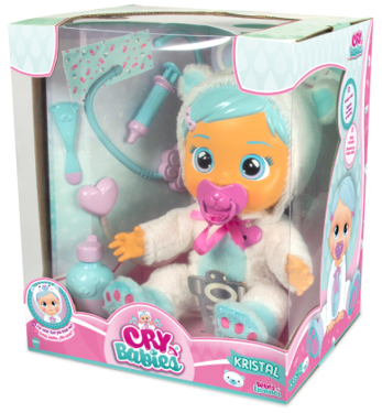 Podobnie jak wszystkie Cry Babies- Kristal również płacze prawdziwymi łzami- gdy wyjmiesz jej smoczka, to zapłacze jak dziecko.