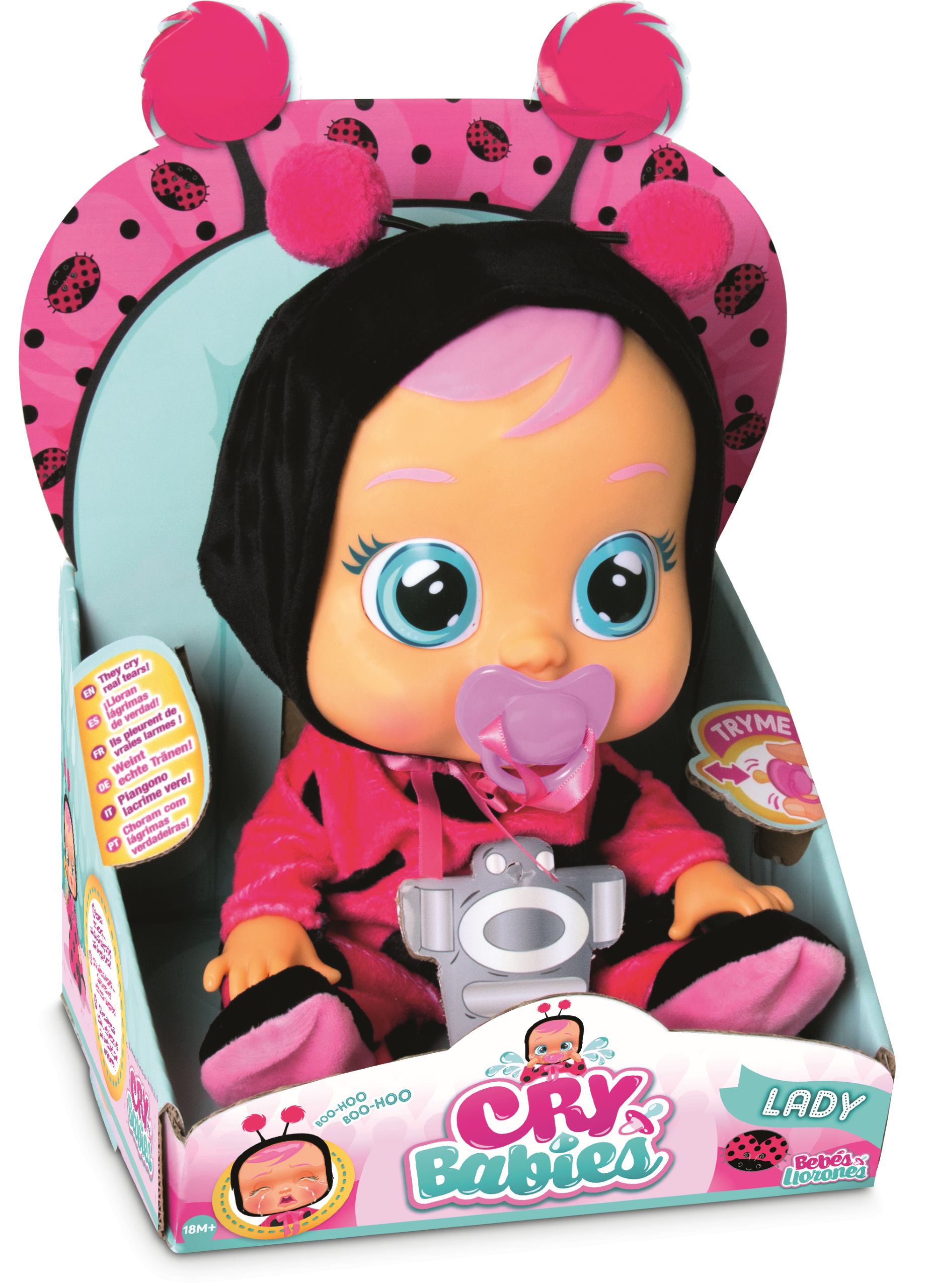 Śliczne bobaski Cry Babies potrzebują kogoś kto je pokocha! Przytul je i daj im smoczek a od razu się uspokoją. Cry Babies płaczą prawdziwymi łzami wydając przy tym autentyczne odgłosy płaczącego malucha. Aby laleczka zaczęła płakać wystarczy wlać wodę do specjalnego pojemnika umieszczonego z tyłu jej głowy i nacisnąć przycisk znajdujący się poniżej lub włączyć laleczkę i wyciągnąć smoczek z jej ust.