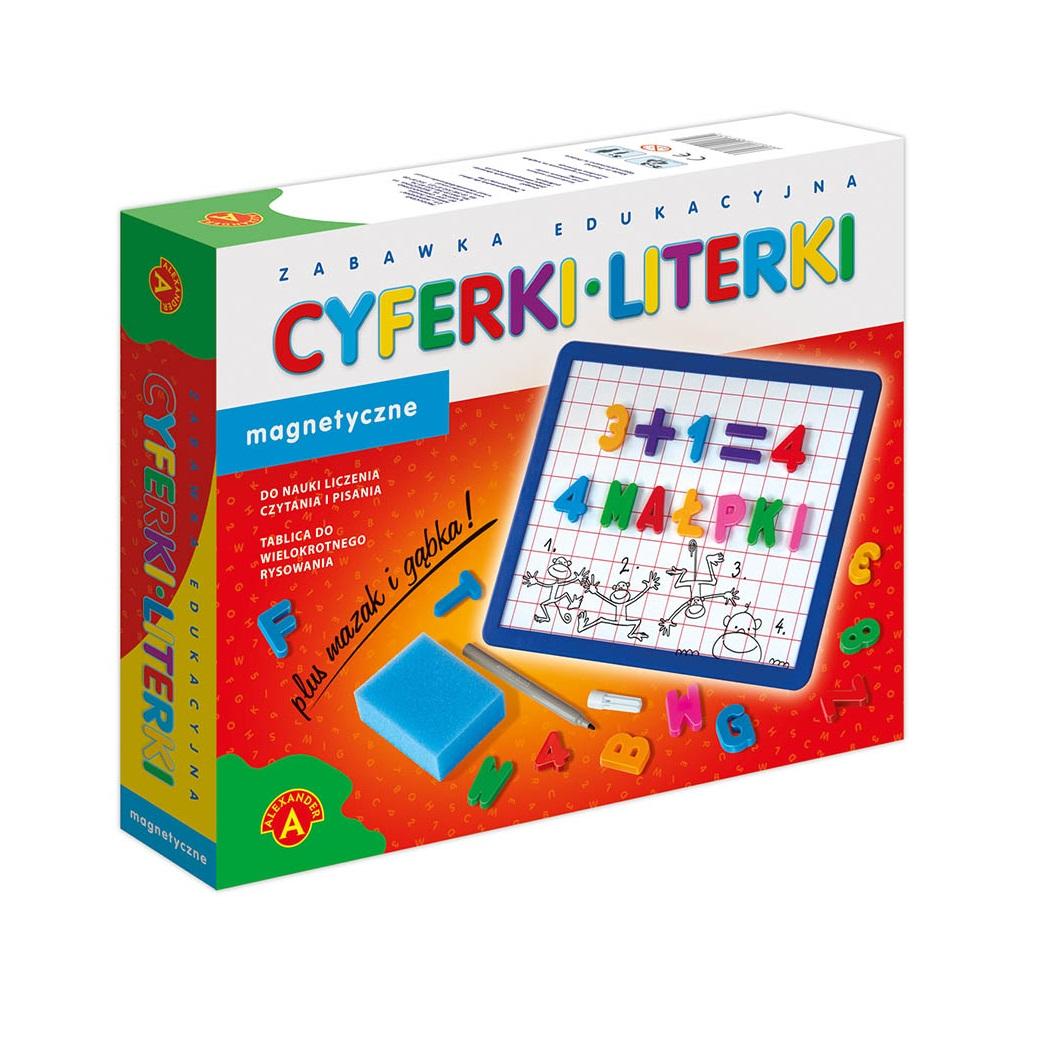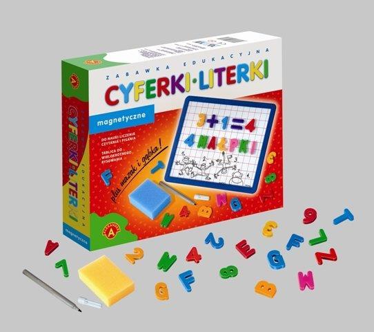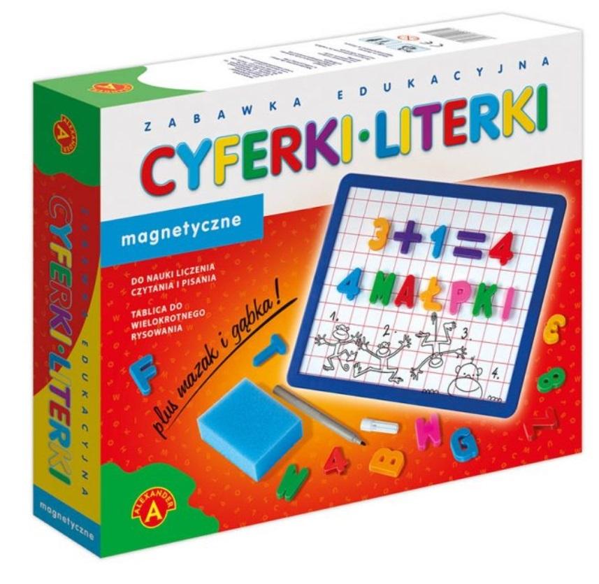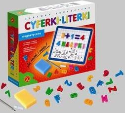 ,,Cyferki i literki magnetyczne"" z metalową tablicą, mazakiem i gąbką to zabawka dla dzieci zaczynających naukę czytania i liczenia. Kolorowe, przestrzenne literki i cyferki są rekwizytami do nauki i zabawy jednocześnie. Dzięki magnesom można je dowolnie układać na metalowej tablicy, niezależnie od kąta jej położenia. Zabawa ułatwia i uatrakcyjnia dzieciom naukę czytania i liczenia. Znajdujący się w pudełku mazak i gąbka są dodatkowym urozmaiceniem. Każdy rysunek lub napis na tablicy można łatwo i szybko zetrzeć gąbką, dzięki czemu mogą powstać następne.Gra dla graczy powyżej 5 roku życia.