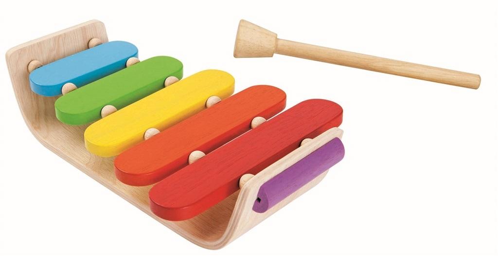Drewniany, 5-klawiszowy ksylofon z pałeczką do grania. Klawisze zawieszone są na elastycznych gumkach. Instrument wydaje łagodne, miłe dla ucha dźwięki.