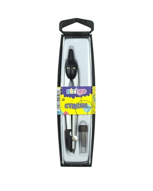 Cyrkiel metalowy z grafitową końcówką w opakowaniu z tworzywa sztucznego. W zestawie komplet 3 dodatkowych grafitów. Kolor: czarny