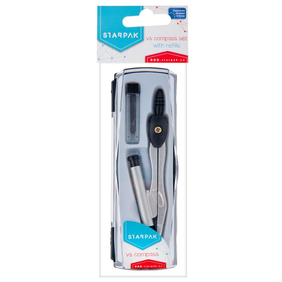 Cyrkiel z ołówkiem automatycznym w komplecie, zapakowany w etui z szybką.