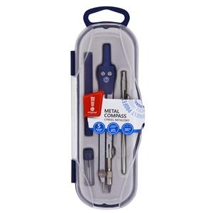 Zestaw 5-elementowy bazowany na metalowym cyrklu z regulacją kąta nachylenia grafitu. Solidny mechanizm regulacji promienia rysowanych okręgów zapobiega efektowi elipsy przy mocniejszym przyciśnięciu cyrkla do papieru. Łatwy w obsłudze system wymiany grafitów. Maksymalna średnica rysowanych okręgów 36c. Idealny do zastosowań szkolnych na lekcjach matematyki, techniki i plastyki.