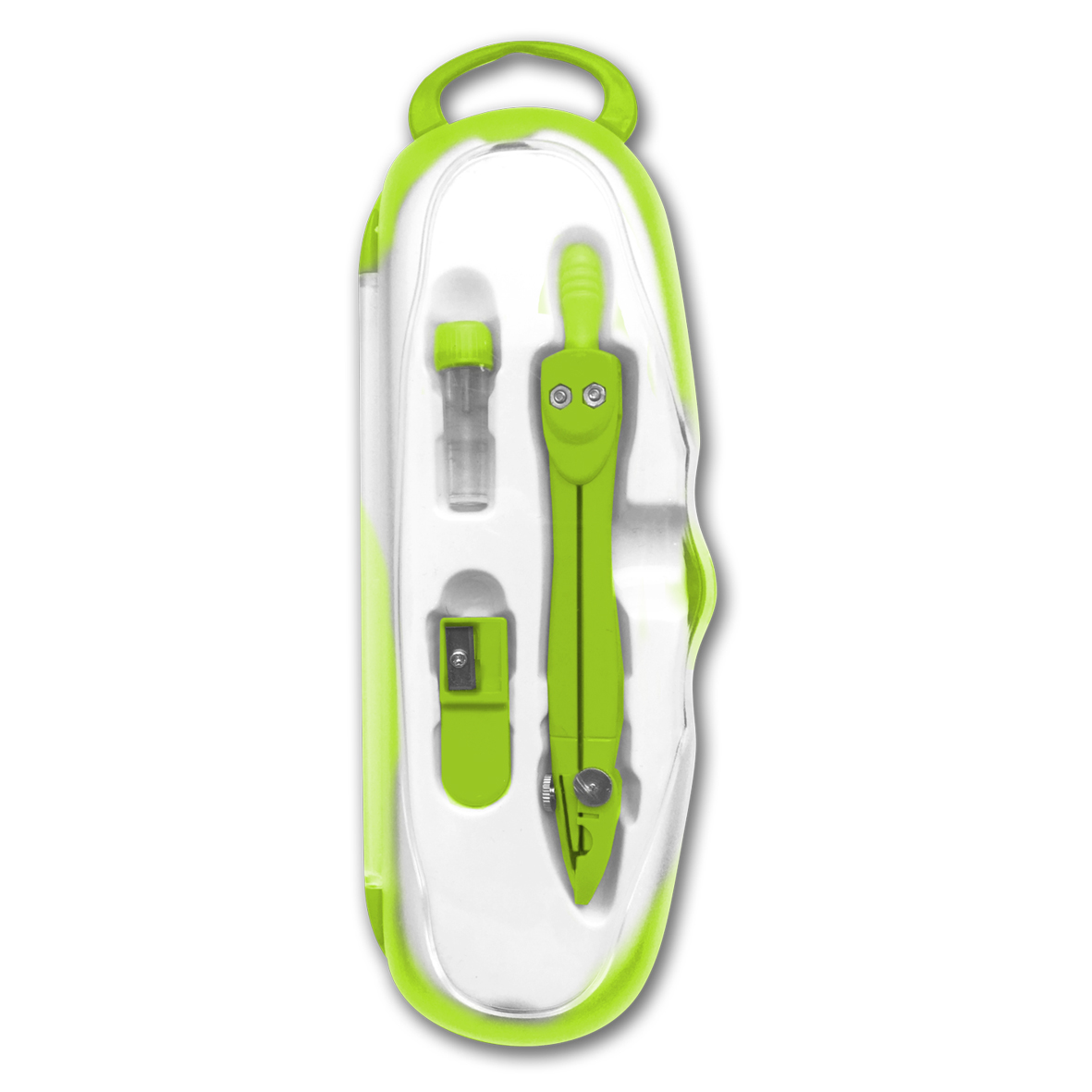 Metalowy cyrkiel z grafitem 2mm. W komplecie pojemnik na zapasowe grafity oraz mini temperówka do grafitów. Całość w kolorowym etui z zawieszką.