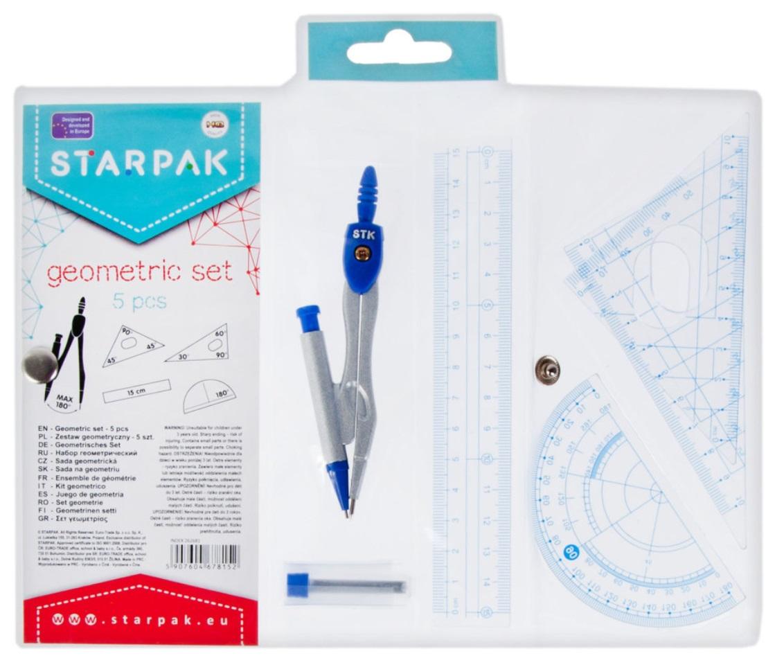 Zestaw geometryczny składający się z cyrkla, linijki, ekierki oraz kątomierza.