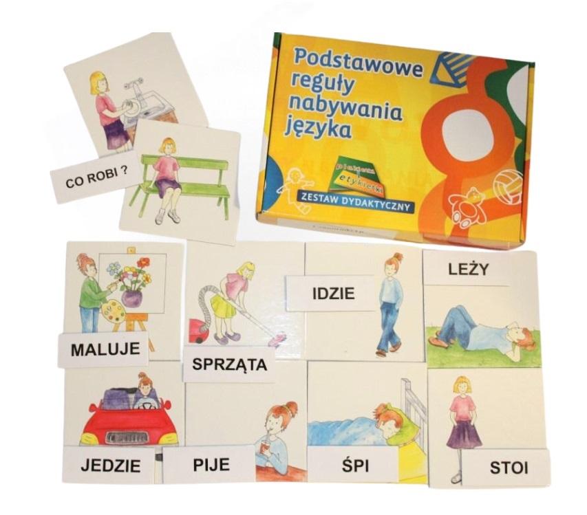 Zestaw plakietek i etykietek służy do przenoszenia obrazów z rzeczywistości na obrazki, uświadamianiu dziecku, że słowo (napis) oznacza konkretną rzecz, czynność czy sytuację oraz do nauki czytania. Uczy dziecko rozumienia pytań oraz udzielania odpowiedzi.Zestaw ten służy do nauki nazw czynności w 3 osobie liczby pojedynczej, nauki czytania pełnymi wyrazami (czytanie globalne), rozumienie pytania: Co robi?