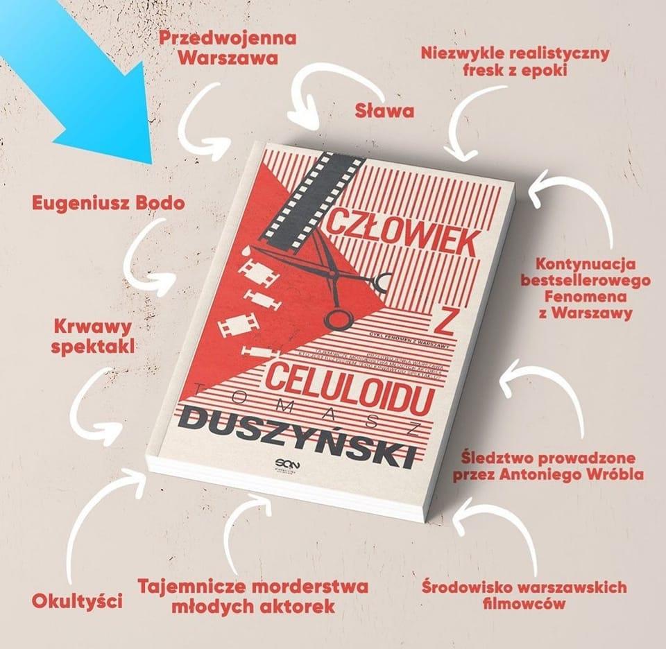 Przedwojenna Warszawa Tajemnicze morderstwa młodych aktorek Kto jest reżyserem tego krwawego spektaklu? Ta niedziela – odwrotnie niż w piosence Mieczysława Fogga – wcale nie miała być dla nich ostatnia. Młode aktorki w przedwojennej Warszawie marzyły tylko o sławie na srebrnym ekranie. Zamiast tego znaleziono je martwe w zamkniętym atelier. Fragmenty nagranych pokątnie filmów z ich udziałem zapowiadają dalsze zbrodnie. Ślady prowadzą do okultystów – i coraz głębiej w przedwojenne środowisko warszawskich filmowców. Ile poświęcisz, żeby stać się gwiazdą? W śledztwie komisarzowi Wróblowi pomaga Antoni Słonimski, jednym z podejrzanych jest Eugeniusz Bodo, a w tle przewija się cały korowód barwnych postaci tych czasów. Kto jest reżyserem krwawego spektaklu, który wstrząsa mieszkańcami stolicy? Wszystko wskazuje na to, że niezależnie od wyniku śledztwa dla Antoniego Wróbla może to być ostatnie dochodzenie. Człowiek z Celuloidu Tomasza Duszyńskiego to kontynuacja bestsellerowego Fenomena z Warszawy i niezwykle realistyczny fresk z epoki, w której życie elit miesza się z historiami prosto z gangsterskiego półświatka i szczegółami biografii przedwojennych celebrytów! Komisarz Antoni Wróbel miał często do czynienia ze śmiercią. Czasem była to śmierć zwykła, ot, o most zaczepiło się napuchnięte niczym balon ciało samobójcy; czasem śmierć głupia i niepotrzebna, gdy grupa pijanych zabawowiczów przebiła samochodem barierkę i skończyła życie w nurtach Wisły. Pojawiały się jednak i inne sprawy, których okrucieństwo trudno było pojąć. Poćwiartowane zwłoki w walizce, ciało dziecka zatopione w szambie, zwłoki małżeństwa, torturowanego i zaszlachtowanego z powodu kilkudziesięciu złotych ukrytych pod materacem. Czy zdarzały się wśród nich sprawy jak ta ostatnia? Siedem ofiar w atelier „Sfinksa” i kolejna ofiara, której okrutna śmierć tak wyraźnie połączona była z poprzednimi? Niewątpliwie był to ciąg zaplanowanych, następujących po sobie wydarzeń. Przeprowadzonych z precyzją, a do tego sugerujących, że liczyć się trzeba z dalszym ciągiem tej popapranej historii. Z takim dochodzeniem komisarz jeszcze nie miał do czynienia. BIOGRAM Tomasz Duszyński Dziennikarz (pracował w RMF FM i Radiu Aplauz), pisarz, scenarzysta gier komputerowych, a w wolnych chwilach maratończyk. Debiutował zbiorem opowiadań Produkt uboczny (2007). Nagradzany autor powieści kryminalnych: zdobywca wyróżnienia jury Kryminalnej Piły, a także nagrody Kryminalny Magiel za najlepszy kryminał retro 2019 roku (Glatz). Laureat Nagród „Złoty Pocisk” w kategorii Najlepsza Polska Powieść Kryminalno-Historyczna 2021 za powieść Glatz. Zamieć i Nagrody Publiczności za powieść kryminalną Glatz oraz Nagrody Wielkiego Kalibru Czytelników za powieść kryminalną Glatz. Kraj Pana Boga.