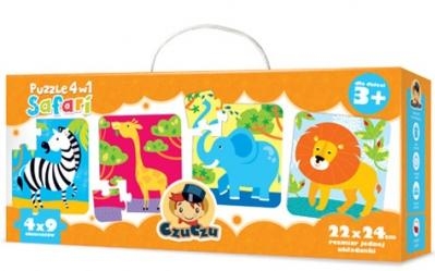 Gotowi na safari? W okolicznościach egzotycznej przygody czeka na was paczka wesołych zwierzaków. Jest lew, przyjazny słoń, zebra oraz żyrafa z szyją tak długą, że sięga nieba.Puzzle dzięki dużym i wytrzymałym elementom, dopasowanym do rączek malucha, przetrwają niejedną wyprawę. Pobudzają też wyobraźnię i rozwijają zdolności manualne.Zestaw zawiera 4 układanki. Każda z nich składa się z 9 dużych elementów. Wymiar po ułożeniu: 22x24 cm.
