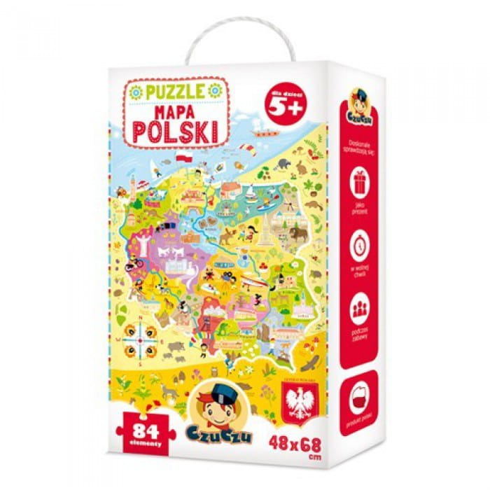 Czy wiecie, kto straszy na zamku w Janowcu? Gdzie są Żółwiowe Błota? Jak wygląda zalipiańska chata? Dokąd wybrać się na spływ kajakowy? Ułóżcie puzzle i przekonajcie się, że w każdym zakątku Polski czeka fascynująca przygoda. Dzięki puzzlom CzuCzu w każdym dziecku obudzi się mały odkrywca, a dorośli znajdą inspirację do wspólnych wycieczek. Układanka składa się 84 wytrzymałych elementów. Wymiar po złożeniu to 48 x 68 cm. Dla dzieci 5+.