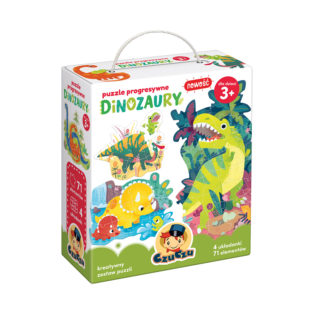 Pełne humoru ilustracje przedstawiają uwielbiane przez dzieci wielkie prehistoryczne gady. Czy rozpoznajecie je wszystkie? Edukacyjny zestaw zawiera 4 układanki o zwiększającej się liczbie elementów, dzięki czemu dzieci mogą stopniowo doskonalić umiejętność układania coraz trudniejszych wieloelementowych puzzli. Doskonale sprawdzi się jako prezent dla dzieci, które są gotowe na coraz większe puzzlowe wyzwania, i dla wszystkich małych fanów wielkich dinozaurów.
