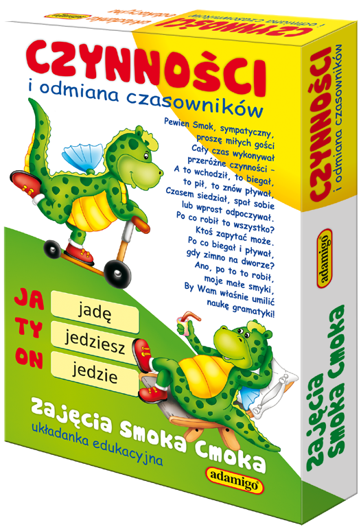 Układanka edukacyjna dla dzieci z klas I-III uczących się odmiany czasowników. Zestaw edukacyjny zawiera dwustronną planszę, 24 duże, dwustronne kartoniki z wierszykami oraz 36 mniejszych kartoników z czasownikami.