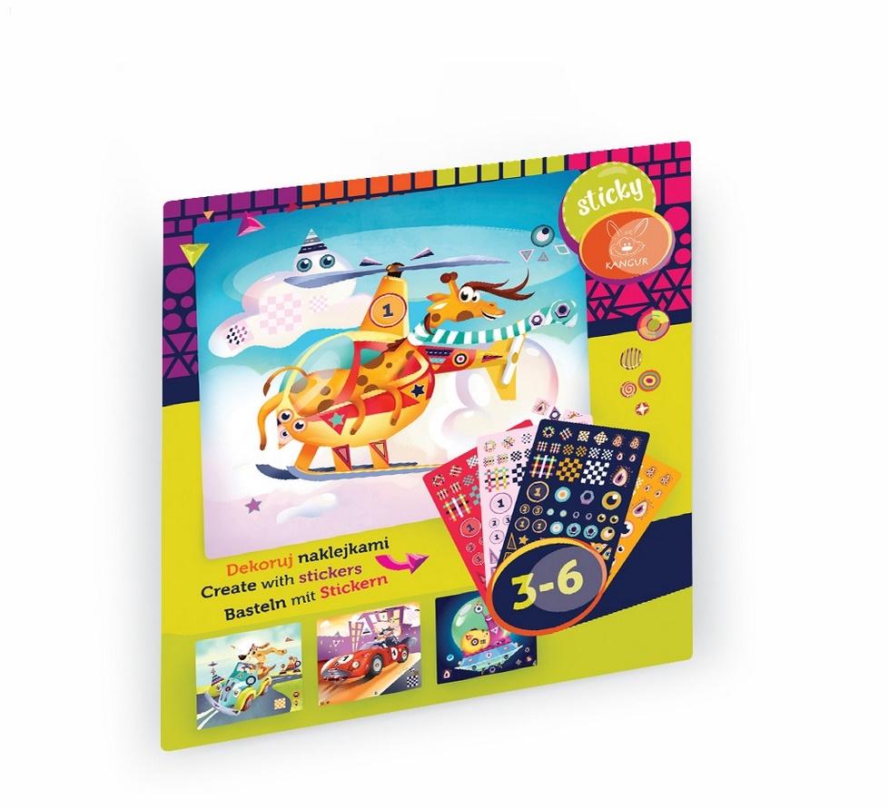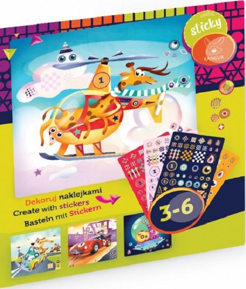Zawartość: 12 obrazków pojazdów, 200 elementów naklejek do dekorowania.