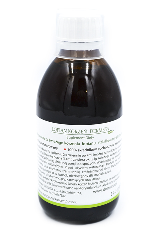 zawiera 19-20% etanol, świeży korzeń łopianu (Arctium tomentosum L.,radix)