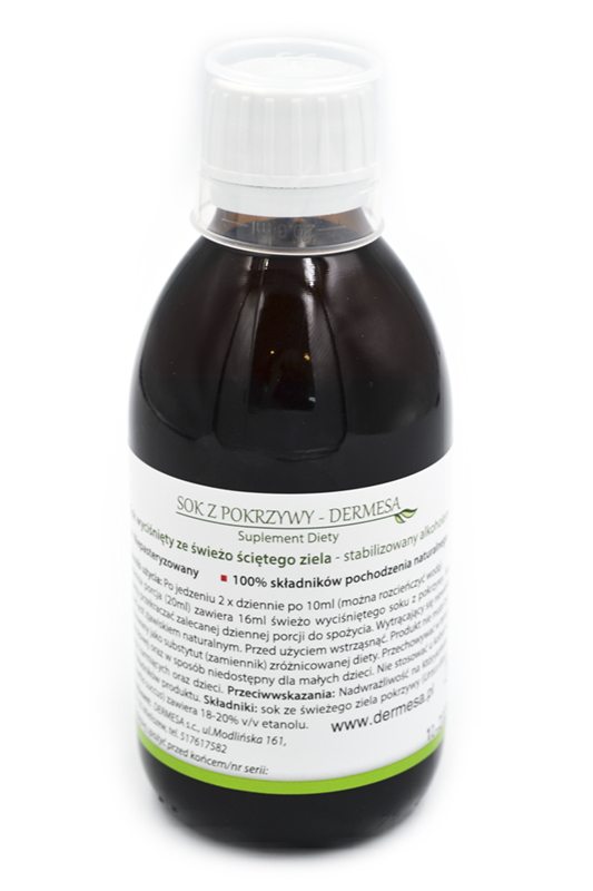 Wykonany ze świeżego ziela młodej pokrzywy, wyciskany tradycyjną metodą, tłoczony na zimno  (nie z koncentratu, nie z ekstraktu, bez dodatku wody, bez dodatku cukru).