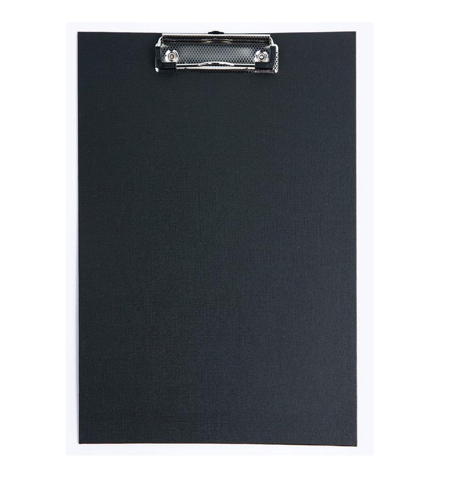 - sztywna podkładka wykonana z tektury pokryta folią PVC - mocny klip z mechanizmem sprężynowym - format A5 - czarna