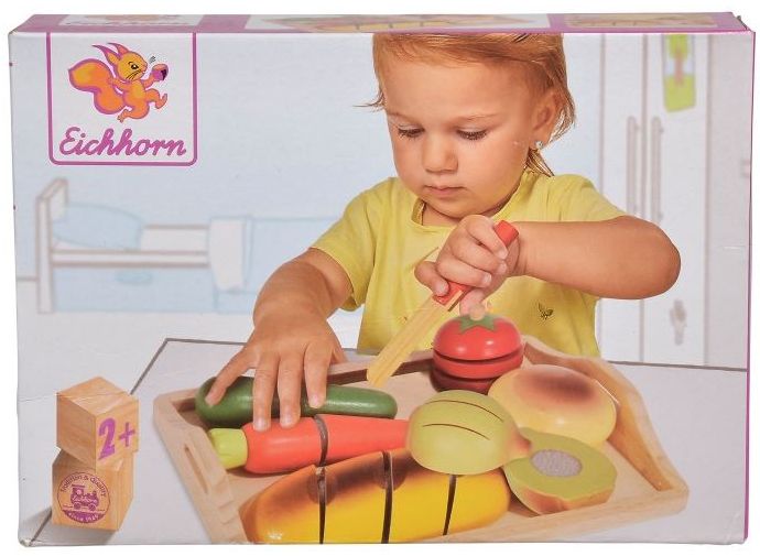 Drewniany zestaw do krojenia owoców lub warzyw, drewniany nożyk i imitacje żywności w dwóch połówkach, drewno dębowe, brzozowe i sklejka, barwione i naturalne, wymiary: 26x16,5 cm, 2+