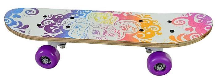 Deskorolka Mini MLP w rozmiarze 17x5 cali, wykonana jest z wytrzymałego materiału - Chiński klon 9 warstw. Deskorolka posiada wzmocniony plastikowy truck, łożyska 608Z oraz koła w rozmiarze 50x30 mm wykonane z PCV. Górna część decki pokryta jest anty-poślizgową taśmą. Strona dolna i górna jest w pełni zadrukowana kolorową grafiką małych koników.