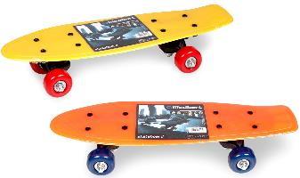 Najmodniejsza deskorolka sezonu w jaskrawych, żywych kolorach. Wykonana z mocnego tworzywa, powierzchnia w fakturowany, antypoślizgowy wzór. Dane techniczne: długość ok. 56cm, kółka PVC 60x45 mm, łożyska 608Z max. obciążenie 60 kg
