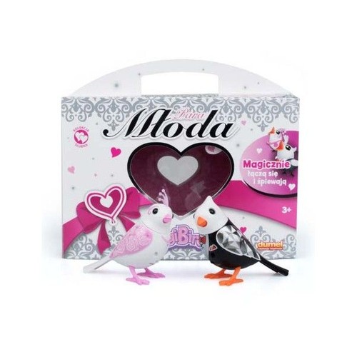 PARA MŁODA. Zestaw składa się z dwóch ptaszków Groom i Bride, które są ucharakteryzowane na parę młodą. Ptaszki potrafią śpiewać, aż na 55 sposobów! Dostępne są w cudnym ślubnym opakowaniu, które idealnie nadaje się jako prezent dla pary młodej.Funkcje: ptaszki ćwierkają i śpiewają solo oraz w chórze, potrafią śpiewać, aż na 55 sposobów (tryb ""on""'), kiedy jest ich kilka, mogą zaśpiewać razem w chórze (tryb ""chór""), pierwszy ptaszek, którego włączymy jest liderem, lider nadaje ton melodii i jej wybór, w zestawie znajduje się ptaszek Groom i ptaszek Bride, każdy z ptaszków posiada imię oraz swój indywidualny charakter, w zestawie z ptaszkiem jest gwizdek-pierścionek, zabawka przeznaczona dla dzieci od 3 lat.