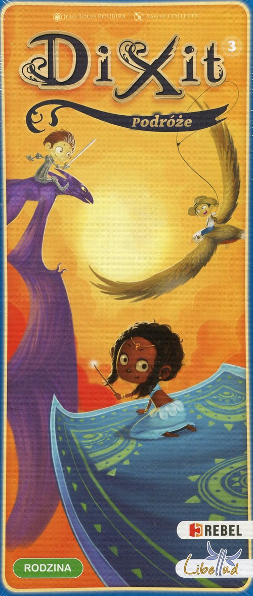Dodatek do gry Dixit lub Dixit Odyssey. Daj znów ponieść się wyobraźni i wyrusz na poszukiwanie nowych skojarzeń. Przy pomocy nowych kart Wasze rozgrywki w Dixit będą jeszcze ciekawsze. Dixit 3 to 84 nowe, świetnie narysowane karty, utrzymane w klimacie magicznego snu. Nowym ilustratorem został Clment Lefevre - ceniony francuski grafik i autor książek dla dzieci oraz młodzieży, rysujący dla wielu renomowanych wydawców. Karty te można łączyć ze wszystkimi edycjami i dodatkami do gry Dixit. Dixit to gra skojarzeń, której niezwykła oprawa graficzna, proste zasady oraz nieograniczona niczym wyobraźnia tworzą nowy wymiar rozrywki. Na czym to polega? Każdy gracz w swojej turze staje się bajarzem. Wybiera spośród swoich 6 obrazków jeden i wymyśla do niego skojarzenie. Zdanie może być pojedynczym słowem, dźwiękiem, cytatem - nie ma tu ograniczeń, można nawet coś zaśpiewać! Następnie pozostali gracze wybierają spośród swoich kart taką, która ich zdaniem najlepiej pasuje do hasła bajarza i kładą zakrytą na stole. Bajarz przetasowuje wszystkie te karty, łącznie ze swoją i układa je na stole, odkrywając. Gracze (poza bajarzem) w tajemnicy głosują, która karta jest tą kartą, do której bajarz wymyślał skojarzenie. Kiedy wszyscy dokonają wyboru, rozpoczyna się przyznawanie punktów. Jeśli nikt nie zgadnie, która karta należała do bajarza, bo jego skojarzenie było zbyt abstrakcyjne, to nie otrzymuje on żadnych punktów, a nagradzani są pozostali gracze. Podobnie jeśli wszystkie głosy wskażą kartę bajarza to znaczy, że skojarzenie było za proste, albo zbyt dosłowne. W innych kombinacjach przydzielane są punkty i uwaga, jeśli którykolwiek z graczy zagłosuje na zagraną przez Ciebie kartę, bo zagrałeś coś co jego zdaniem lepiej pasowało do skojarzenia to dostajesz bonusowe punkty! Warto więc sprytnie zagrywać karty, próbując zmylić innych graczy, jednocześnie zachowując te, do których mamy ciekawe skojarzenie i czekając z ich zagraniem do momentu, aż przyjdzie Twoja kolej. Pamiętaj, że jeden obraz jest wart więcej niż tysiąc słów! Autorem gry jest Jean Louis Roubira, lekarz pracujący w szpitalu w Poitiers z młodymi pacjentami przeżywającymi trudności w środowisku szkolnym i poza nim. Po kilku rozgrywkach w Dixit zaobserwowano u nich znaczną poprawę formułowanych wypowiedzi oraz relacji z innymi ludźmi. Gra może służyć również jako narzędzie pedagogiczne i terapeutyczne. Liczba graczy: 3 - 6 osób. Wiek: od 8 lat.Czas gry: ok. 30 minut. Waga: ok. 0.30 kg. Zawartość pudełka: 84 nowe karty.