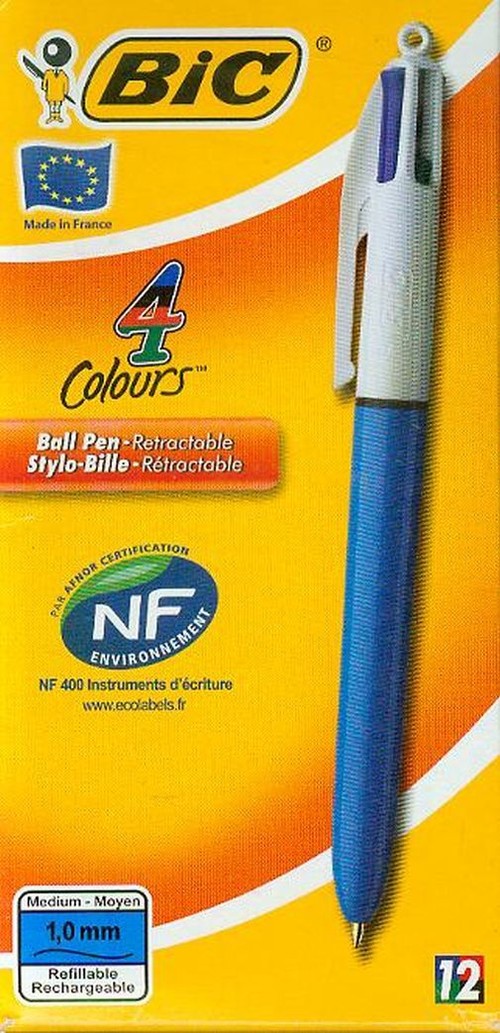 Długopis automatyczny. 4 kolory wkładu (niebieski, czarny czerwony, zielony). Uchwyt na smycz. Średnia końcówka 1,0 mm. Kod kreskowy na każdym długopisie.