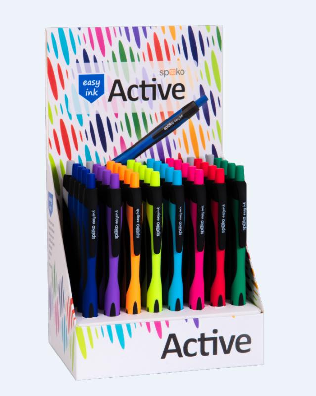 Długopis Spoko Active występuje w różnych wariantach kolorystycznych. Ma obudowę dwukolorową, antypoślizgową i specjalny niebieski wkład easyink, który sprawia, że bardzo wygodnie oraz miękko się nim pisze. Opakowanie zbiorcze mieści w sobie 40 egz.