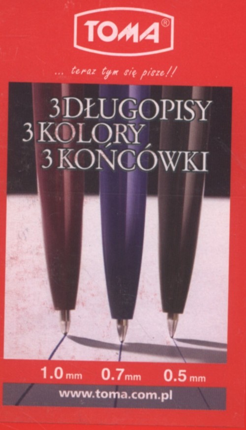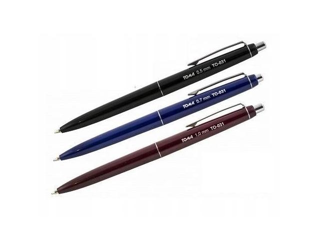 Długopis automatyczny w plastikowej obudowie, elegancka stylistyka, metalowy klip oraz dodatki, 3 kolory obudowy, 3 końcówki piszące, tusz niebieski, trwały mechanizm włączający, wymienny wkład.- obudowa czarna końcówka 0,5mm- obudowa granatowa końcówka 0,7mm- obudowa bordowa końcówka 1,0mm. Dostępne kolory tuszu: niebieski. 45 sztuk w opakowaniu.