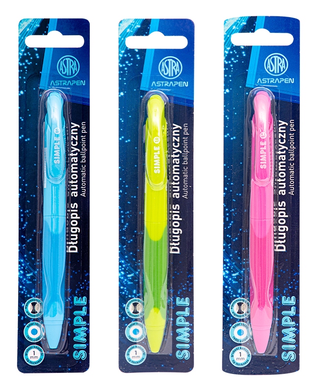 Automatyczny długopis Astrapen Simple posiada ergonomiczny uchwyt, zapewniający wysoki komfort użytkowania. Dzięki nowoczesnemu wzornictwu, żywej i intensywnej kolorystyce sprawdzi się idealnie zarówno w szkole, na uczelni, jaki i w biurze.