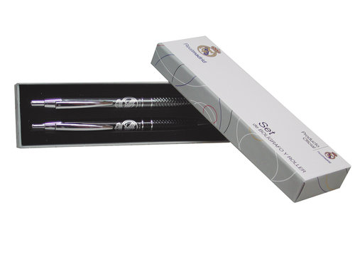 Excluzywny zestaw: Metalowy długopis + Metalowy długopis żelowy, zapakowane w zdobione pudełko na licencji klubu Real Madrid. Kolor Stalwoy i czarny.