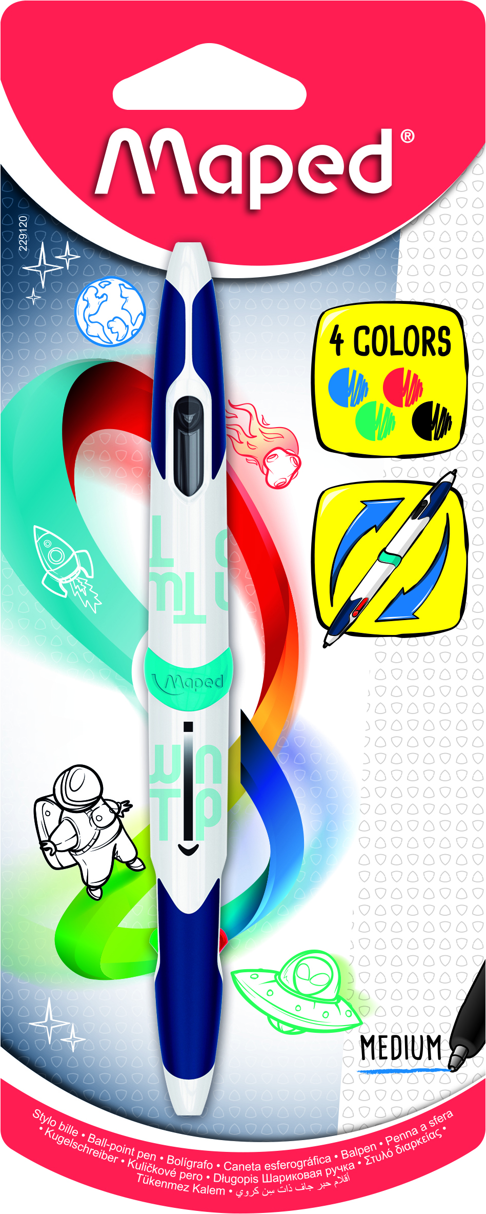 Czterokolorowe długopisy dwustronne - wersja BASIC (kolory wkładów - czerwony, zielony, niebieski i czarny). Innowacyjne rozwiązanie pozwala używać 2 kolorów jednocześnie. Miękka strefa zapewnia optymalny uchwyt i wysoki komfort pisania. Idealny dla osób prawo i leworęcznych. Grubość linii 1.0 mm. Blister