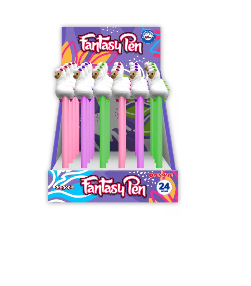 Fantazyjne długopisy zaskakują nie tylko oryginalnym wzornictwem, ale także super kolorowymi dusplejami. które wyróżniają się na sklepowej półce. Długopisy mają niebieski wkład z końcówką 0.7 mm. Gumowe nasadki występują w różnych kolorach i wzorach. Kod kreskowy na obudowie każdego długopisu.