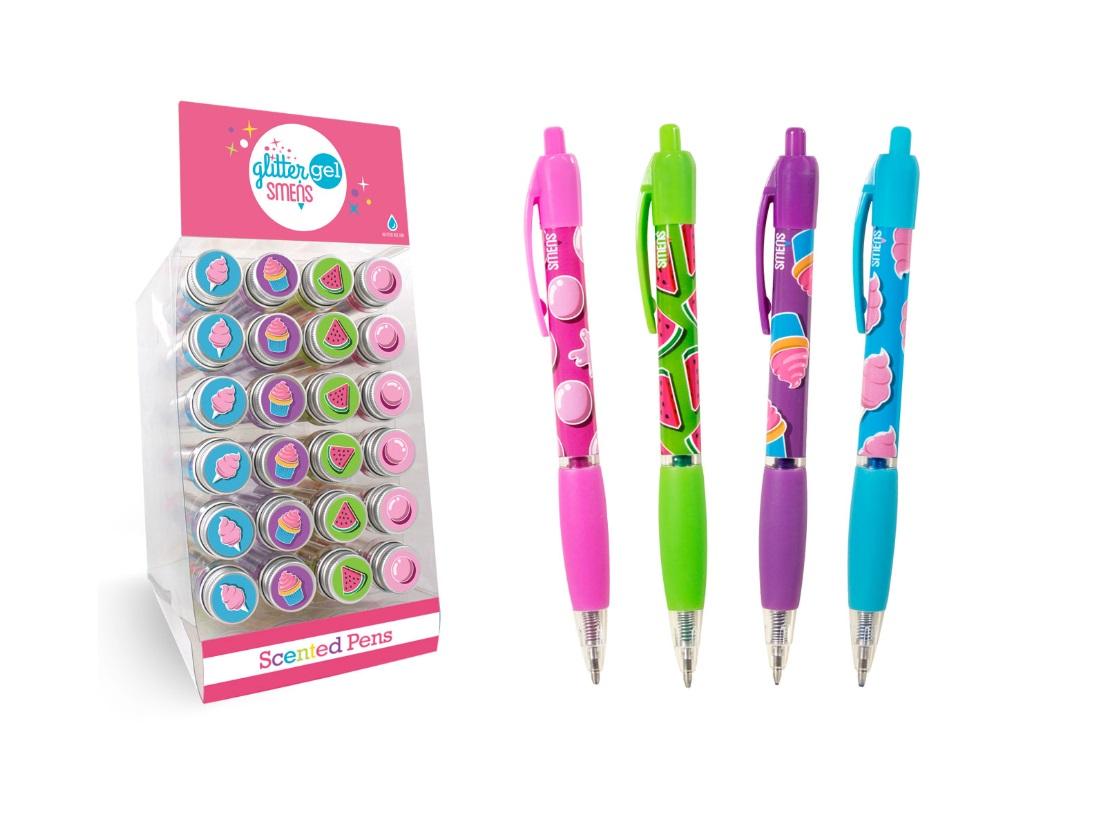 Pachnące Długopisy Smens w różnych kolorach i zapachach: różowy - guma balonowa, fioletowy - babeczka, niebieski - wata cukrowa, zielony - arbuz. Żelowy i brokatowy tusz. Pachnąca oprawka długopisów. Zapach utrzymuje się dwa lata.