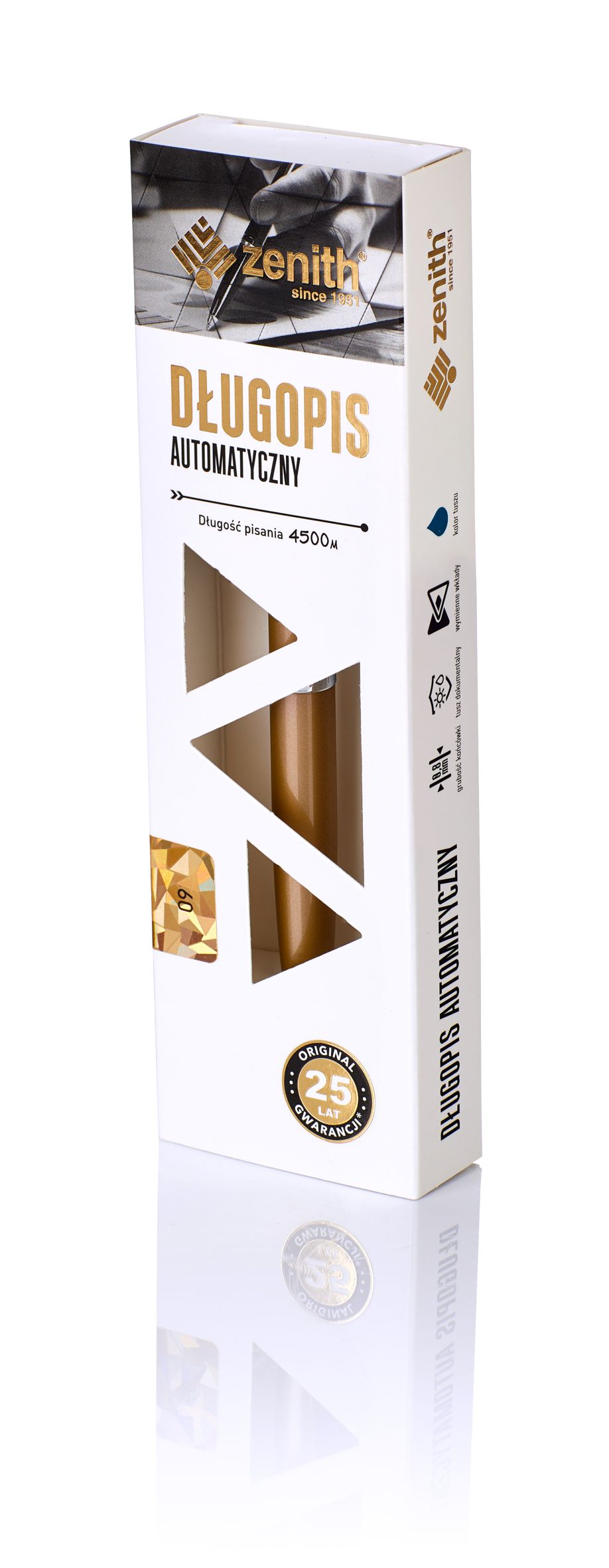 Długopis automatyczny z nikowanymi elementami. Korpus wykonany z błyszczącego tworzywa sztucznego. Obudowa dzielona w 1/3 wysokości (górna część ośmiokątna) obie części korpusu oddzielone mosiężno-niklowaną obrączką. Kolor złoty.