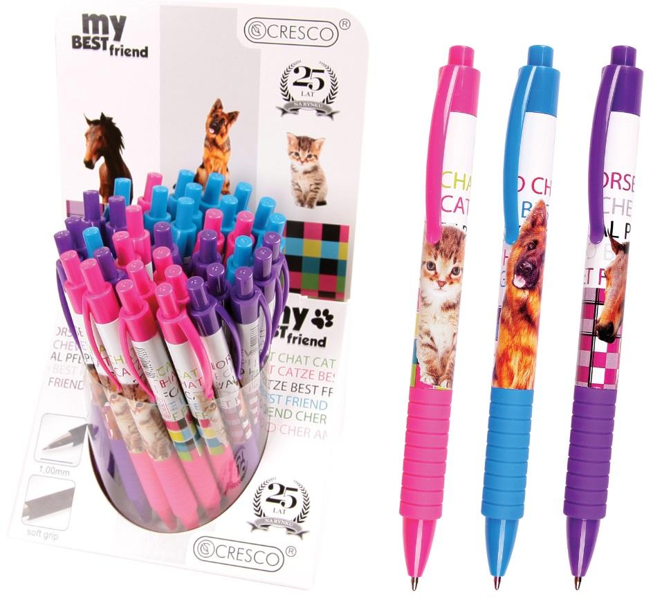 Grubość lini pisania 1,00 mm, gumowy uchwyt, atrament w kolorze niebieskim.