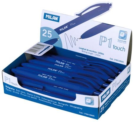 Długopis w kolorze niebieskim z matową satynową powłoką TOUCH w dotyku jak gumka. Długość linii pisania: 1200 m. 25 sztuk w pudełku.