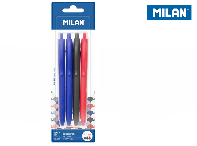 Zestaw 4 długopisów: 2 niebieskie, 1 czarny i 1 czerwony z matową satynową powłoką TOUCH w dotyku jak gumka. Długość linii pisania: 1200 m, grubość linii: 1 mm.