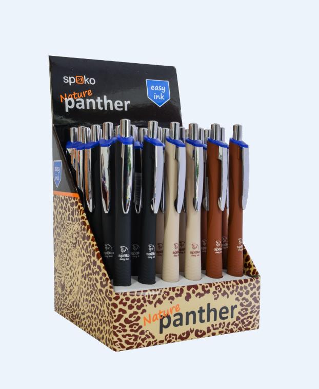 Długopis Spoko Panther występuje kolorach natury. Ma obudowę jednokolorową, antypoślizgową ze specjalnie wyprofilowaną sekcją uchwytu, która sprawia, że bardzo wygodnie się nim pisze. Ma tez niebieski wkład easyink. Display mieści w sobie 36 egz.