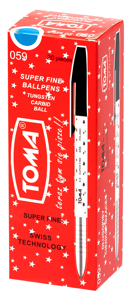 Długopis jednorazowy w plastikowej obudowie w gwiazdki w kolorze tuszu, wentylowana nasadka, trwała kulka z węglików spiekanych wolframu 0.5 mm. Super cienko-piszący opatentowany wkład Floating Ball ® szwajcarskiej firmy Premec.