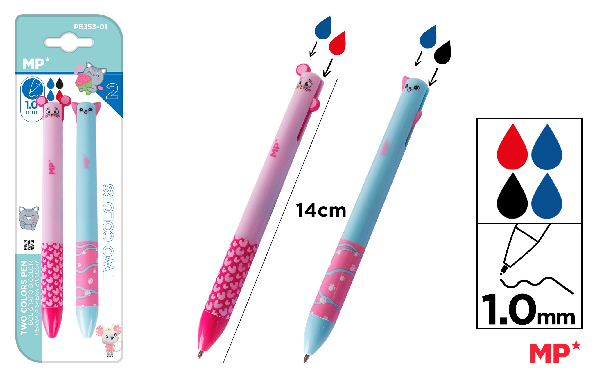 Długopis ścieralny dwukolorowy kotek i myszka 2szt