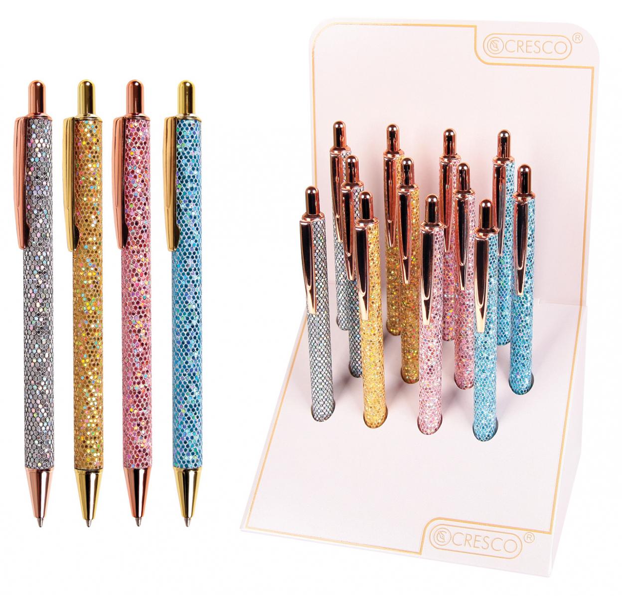 Długopis z wkładem koloru niebieskiego. Materiał: metal aluminium. Grubość linii pisania: 1 mm. Mechanizm włączania: pstrykany. Wykończenie: różowe złoto, błyszczące, świecący korpus.