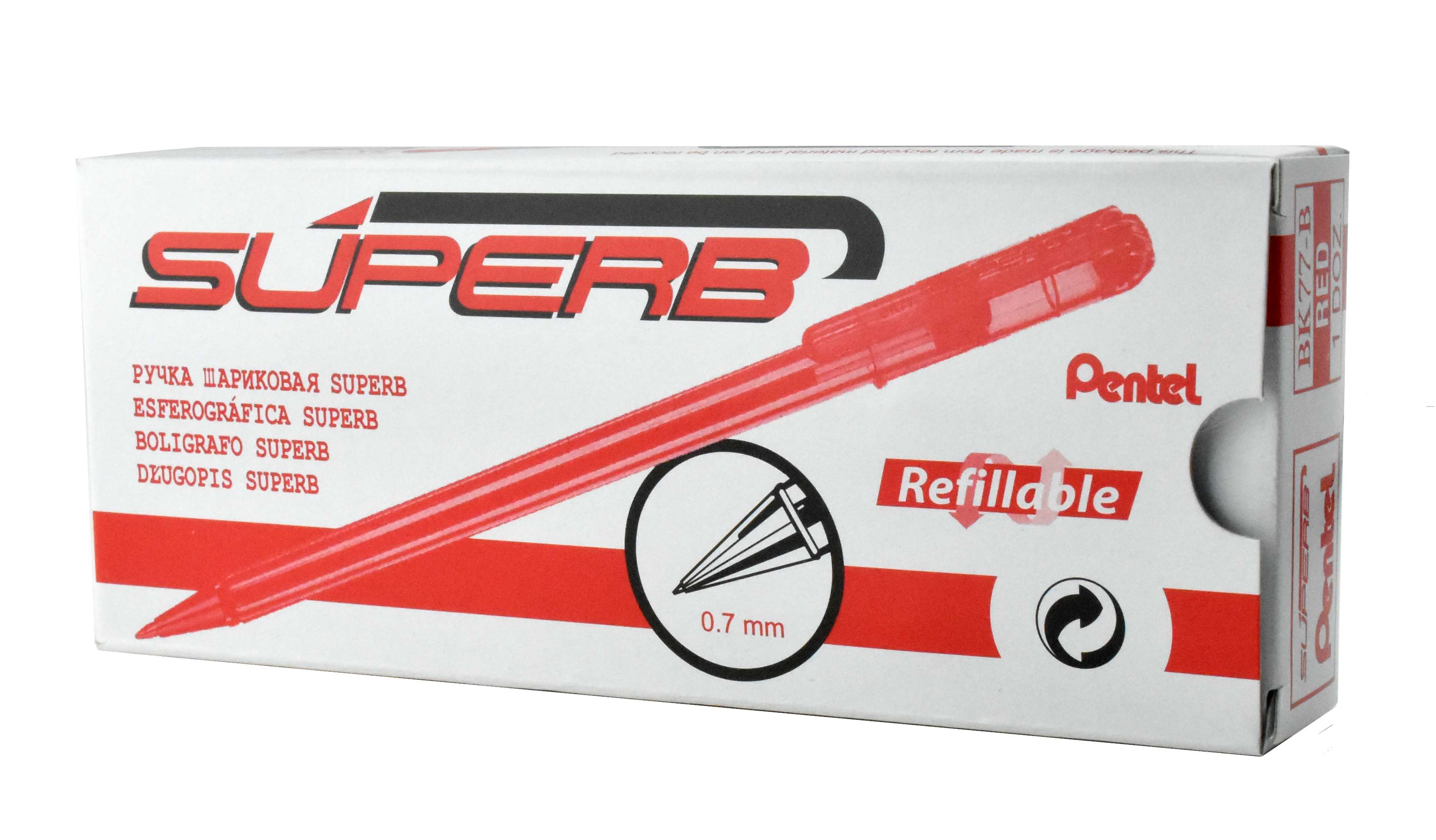 Długopis BK77 to niecodzienny klasyk za niewygórowaną cenę. To taki produkt, który powinien znaleźć się w każdym biurze i każdym piórniku - wysoka jakość materiałów, z których jest zrobiony i niska cena niecodziennie idą w parze, zachwycając wielością zastosowań. Produkowany we Francji z wyjątkową dbałością o szczegóły spełnia najwyższe międzynarodowe standardy ISO 9001 oraz ISO 12757-1, co potwierdza jego wysoką klasę i staranne wykonanie. Końcówka o grubości 0,7mm została wykonana z ""niklowanego srebra"", kulka zaś ze stali hartowanej - dzięki tym materiałom długopis jest praktycznie niezniszczalny, a końcówka płynie po kartce papieru lekko i przyjemnie, zostawiając precyzyjną, cienką kreskę o grubości 0,27mm. Ten lubiany i popularny produkt charakteryzuje prosta, klasyczna, przezroczysta obudowa, która ułatwia kontrolę zużycia tuszu. Wkład choć można wymieniać (BKL7), nie trzeba robić tego często - długość linii pisania wynosi bowiem ok. 1700 m i jest to wynik pierwszoligowy! Prawie 2 km pisania przy tak innowacyjnych parametrach pozytywnie wpłynie na planowanie budżetu na firmowe wydatki biurowe! Kolorowe wykończenia smukłego korpusu adekwatne do barwy wkładu wesoło zachęcają do pisania, notowania i podkreślania. Wygodny klip wepnie się w każdą marynarkę, koszule i bluzę, pozostając świetną propozycją zarówno dla uczniów i studentów, jak i pracowników biur. Długość linii pisania 1700m. Grubość końcówki 0.7mm. Grubość linii pisania 0.27mm. Wkład wymienny BKL7. Cechy wyróżniające - Jedyny, oryginalny Pentel SUPERB BK77.