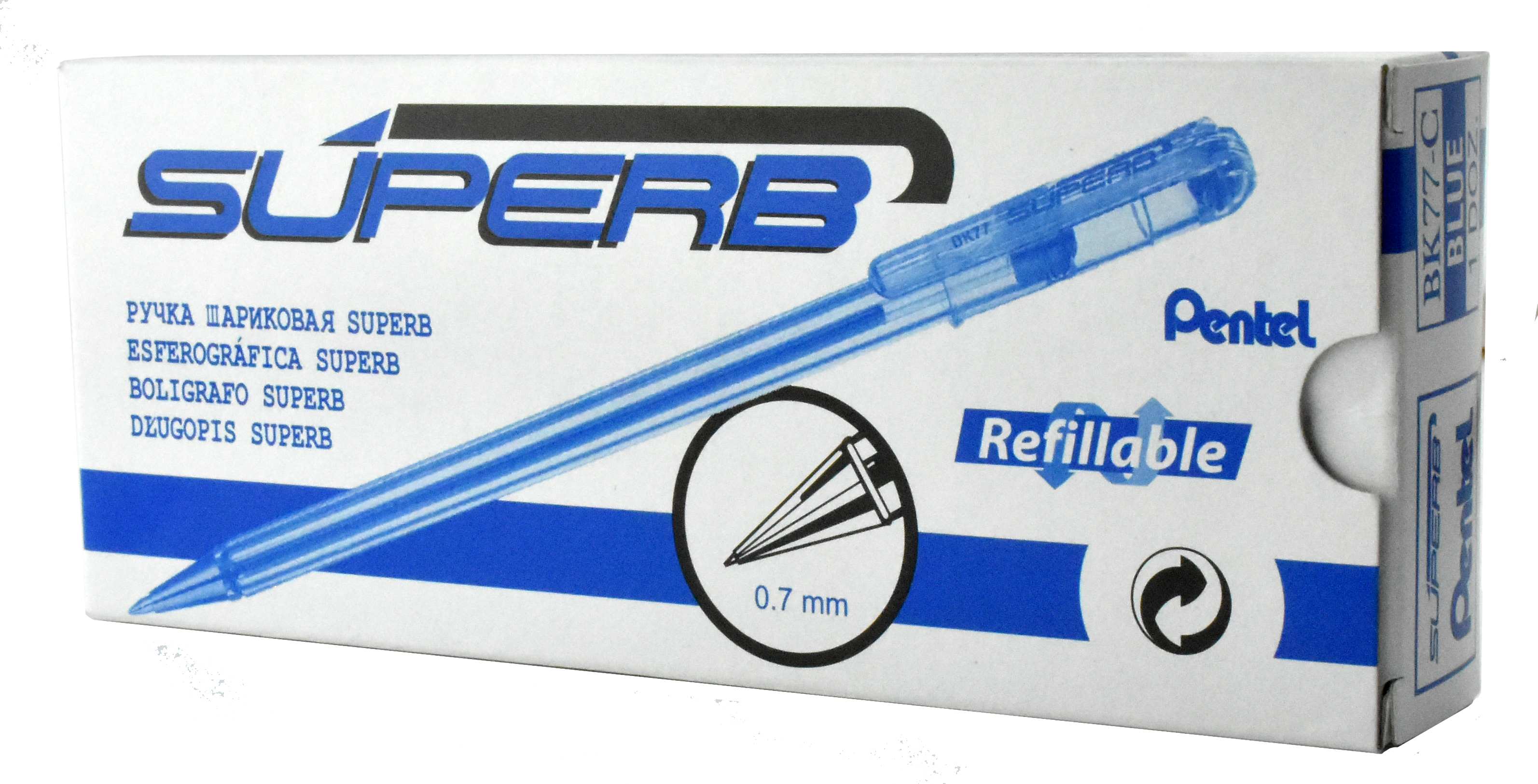 Długopis BK77 to niecodzienny klasyk za niewygórowaną cenę. To taki produkt, który powinien znaleźć się w każdym biurze i każdym piórniku - wysoka jakość materiałów, z których jest zrobiony i niska cena niecodziennie idą w parze, zachwycając wielością zastosowań. Produkowany we Francji z wyjątkową dbałością o szczegóły spełnia najwyższe międzynarodowe standardy ISO 9001 oraz ISO 12757-1, co potwierdza jego wysoką klasę i staranne wykonanie. Końcówka o grubości 0,7mm została wykonana z ""niklowanego srebra"", kulka zaś ze stali hartowanej - dzięki tym materiałom długopis jest praktycznie niezniszczalny, a końcówka płynie po kartce papieru lekko i przyjemnie, zostawiając precyzyjną, cienką kreskę o grubości 0,27mm. Ten lubiany i popularny produkt charakteryzuje prosta, klasyczna, przezroczysta obudowa, która ułatwia kontrolę zużycia tuszu. Wkład choć można wymieniać (BKL7), nie trzeba robić tego często - długość linii pisania wynosi bowiem ok. 1700 m i jest to wynik pierwszoligowy! Prawie 2 km pisania przy tak innowacyjnych parametrach pozytywnie wpłynie na planowanie budżetu na firmowe wydatki biurowe! Kolorowe wykończenia smukłego korpusu adekwatne do barwy wkładu wesoło zachęcają do pisania, notowania i podkreślania. Wygodny klip wepnie się w każdą marynarkę, koszule i bluzę, pozostając świetną propozycją zarówno dla uczniów i studentów, jak i pracowników biur. Długość linii pisania 1700m. Grubość końcówki 0.7mm. Grubość linii pisania 0.27mm. Wkład wymienny BKL7. Cechy wyróżniające - Jedyny, oryginalny Pentel SUPERB BK77.
